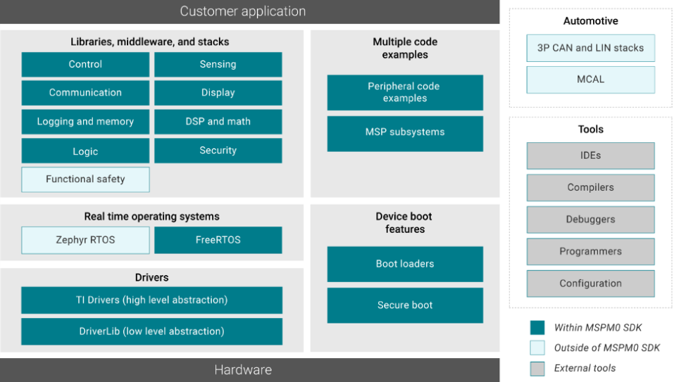 MSPM0 MCU 的开发提供了代码示例、驱动程序、中间件库和 RTOS。